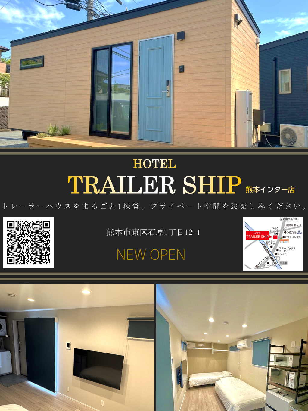 熊本県熊本市を拠点とするトレーラーハウス専門店です。「誠心誠意」を理念に、お客様目線でお客様想いのトレーラーハウスづくりを大切にしています。 その為、迅速で丁寧な対応・施工・アフターフォローに力を入れ、お問い合わせからアフターフォローまで自社スタッフが誠実に対応させていただきます。弊社は全国的にも数少ない車検不要型のトレーラーハウスをメインに取り扱っております。 その為、ご利用目的に合わせて、住居・店舗・飲食店・事務所・サウナ・グランピング・美容室…など様々な用途に対応可能です。車両扱いとなる為、条件を満たせば市街化調整区域でも設置可能。土地探しからもお任せいただけますので、土地、資金計画、ローン、運搬等、ご不安なことがありましたら、トレーラーシップにお任せください。地元熊本で生まれ、熊本で育った強みを活かし、熊本市、八代市、玉名市、山鹿市、菊池市、宇土市、宇城市、阿蘇市、合志市、大津町、菊陽町、南阿蘇村、御船町、嘉島町、益城町など熊本県内はもちろん福岡県などでトレーラーハウスに関心がある方からのご相談をお受けしています。